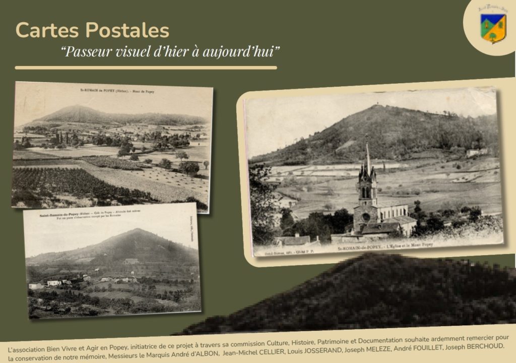 Trois pancartes (cartes postales, histoire du Mont Popey, légendes) qui seront installées à l’intérieur de la cabane du Bancillon.