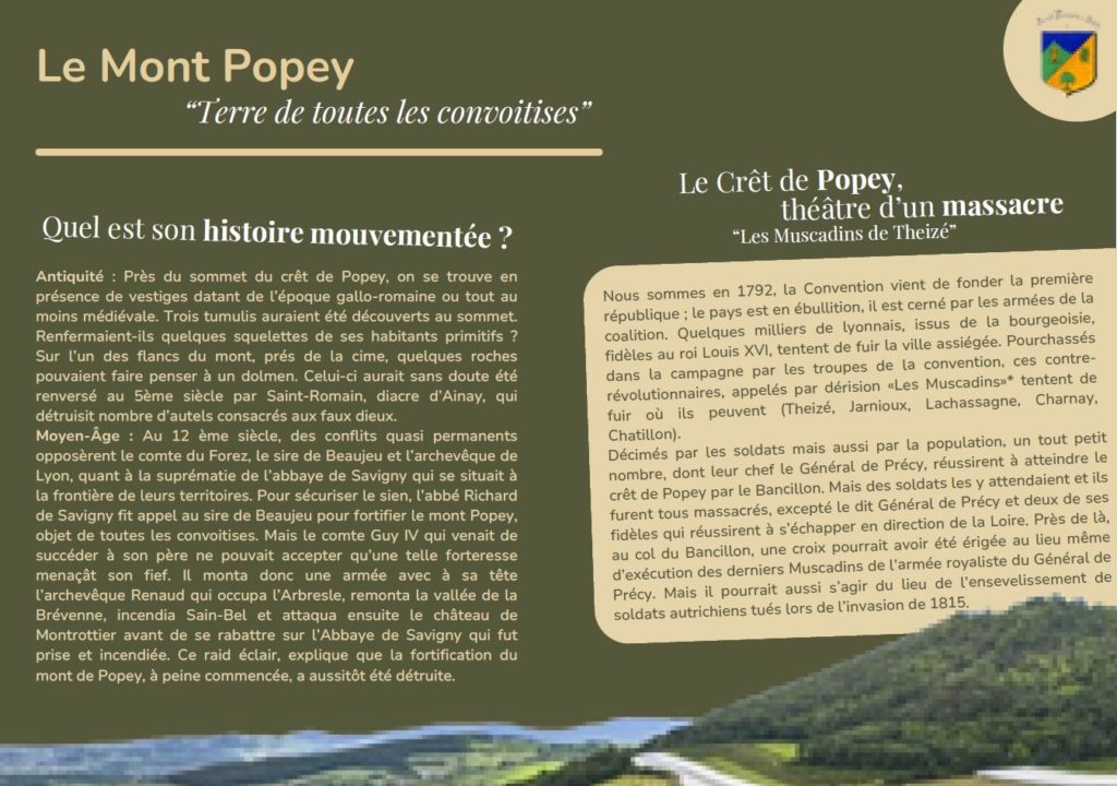 Les membres de la commission culture et patrimoine ont travaillé pendant plus d’un an et préparé 5 pancartes qui seront imprimées et fixées près du Mont Popey et de la cabane du Bancillon par la mairie :